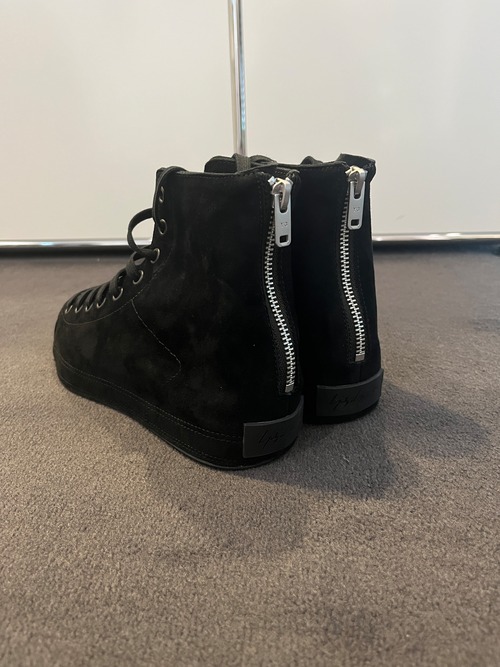 背面に着脱を容易にするジップを備え、タンにはY-3ロゴ、ヒールパッチにはYohji Yamamotoのシグネチャーがあしらわれている。