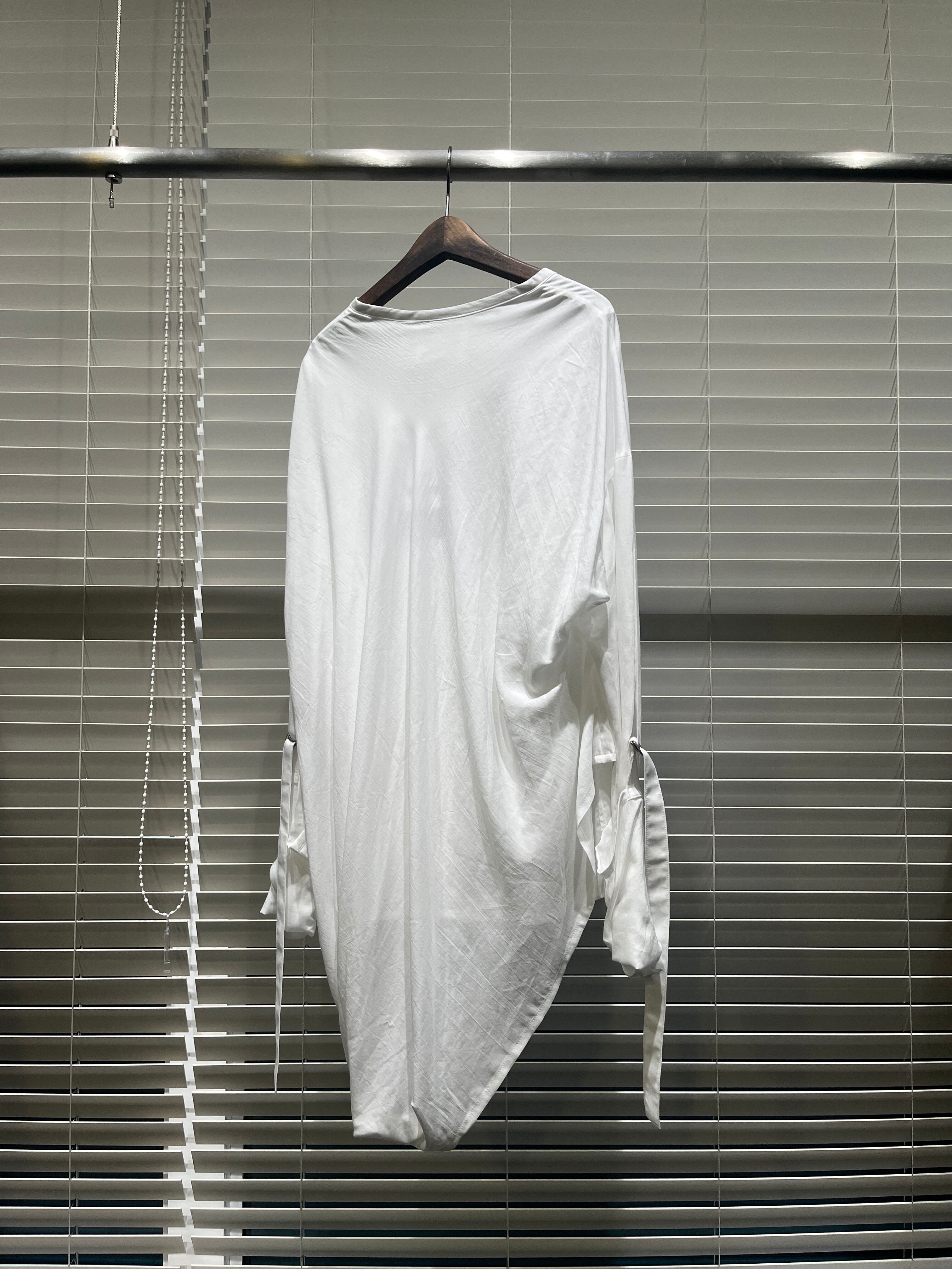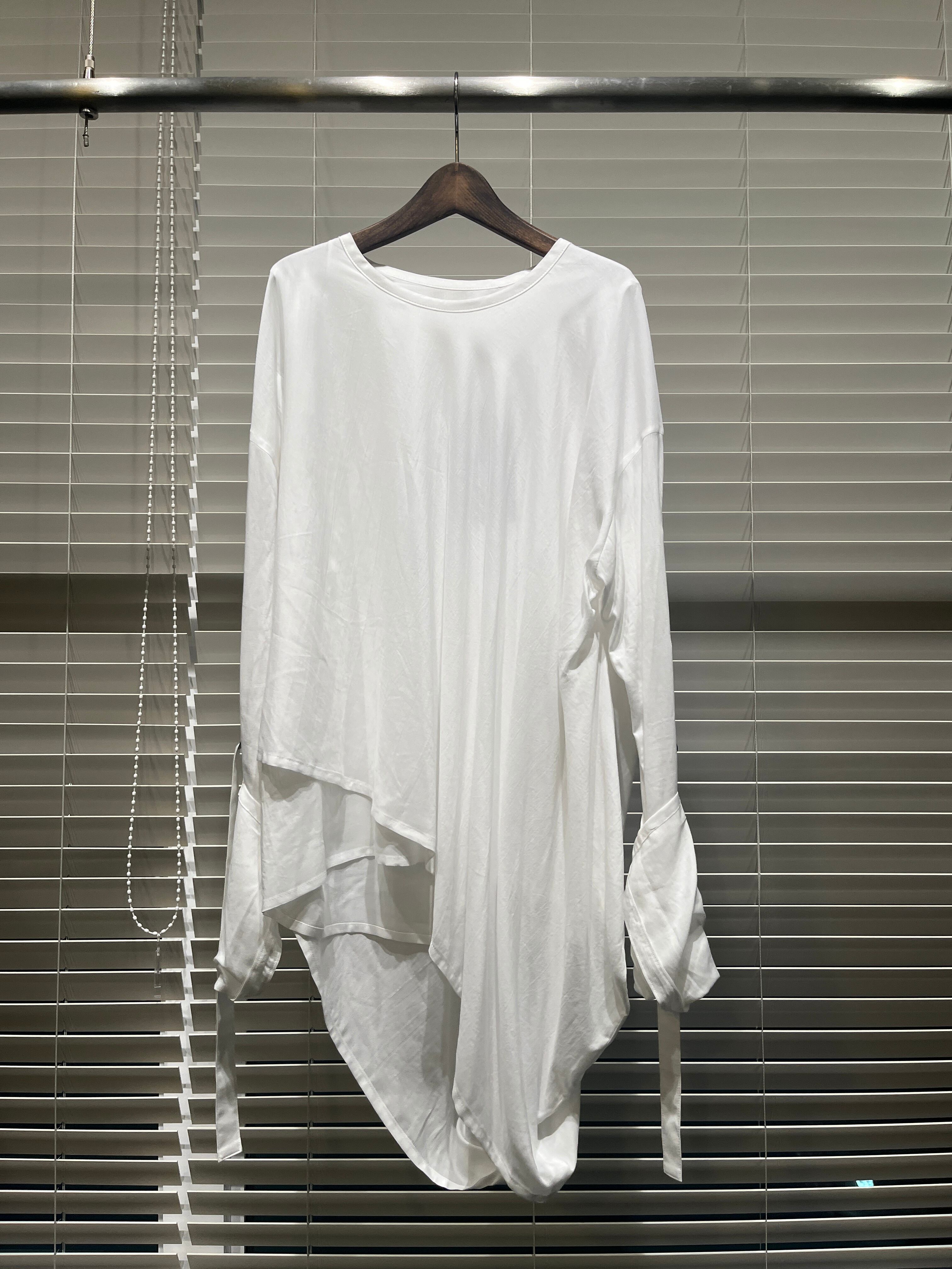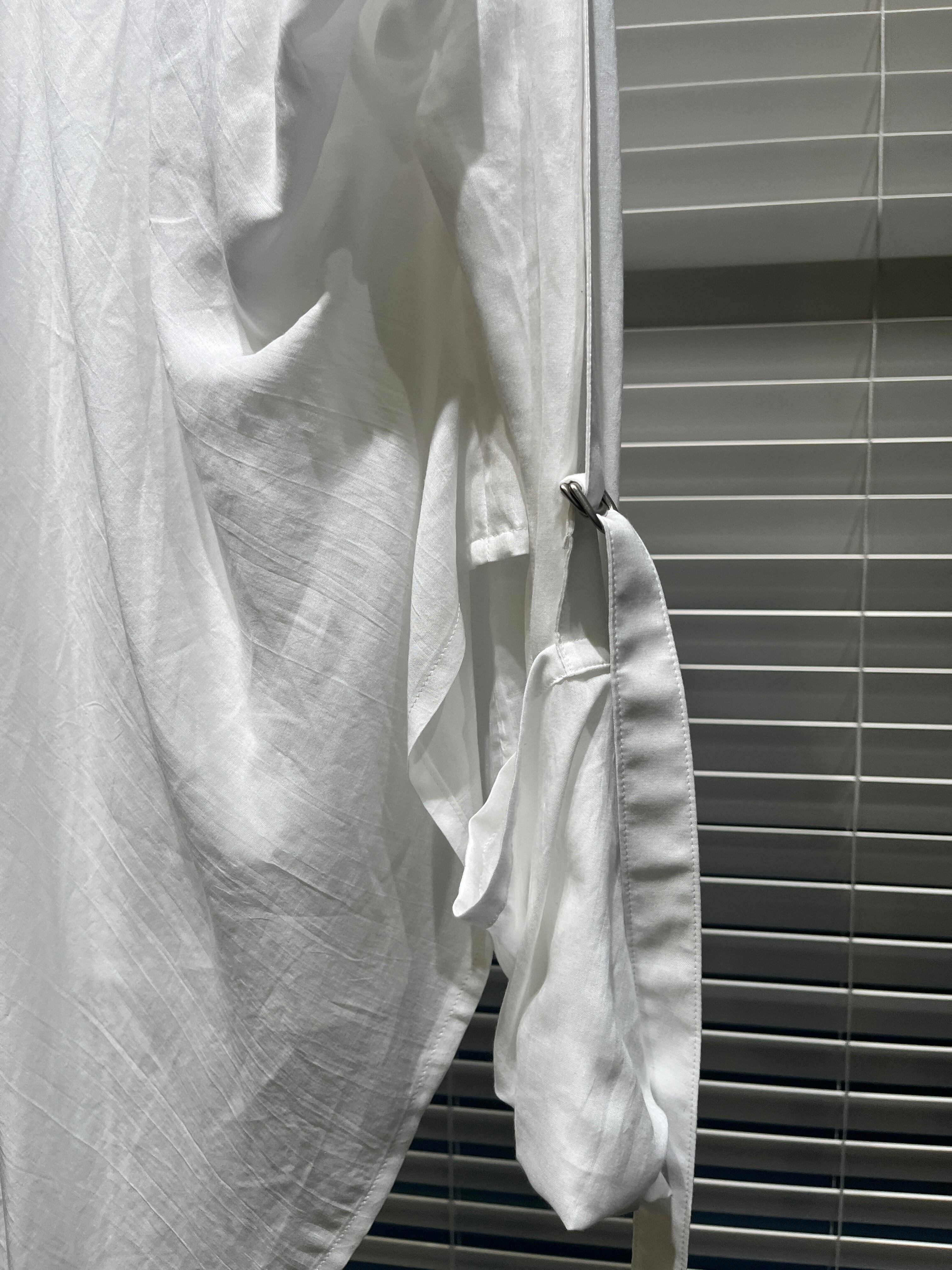袖にDカンがついたブラウスです。袖の長さはDカンの吊るす長さで変更可能。後ろ身頃はドレープを感じる流れるデザインでカジュアルにご着用頂けます。